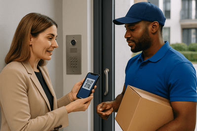 Residents see who is requesting access and approve from a phone. Managers can issue temporary QR or PIN credentials directly from the intercom platform. -
